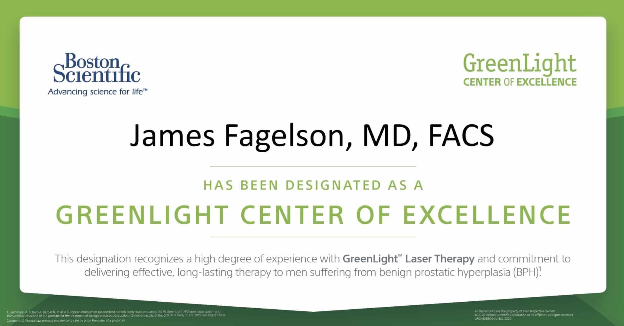 Dr. James Fagelson designated as a Center of Excellence for GreenLight™ Laser Therapy, a Treatment for Benign Prostatic Hyperplasia (BPH), or Enlarged Prostate