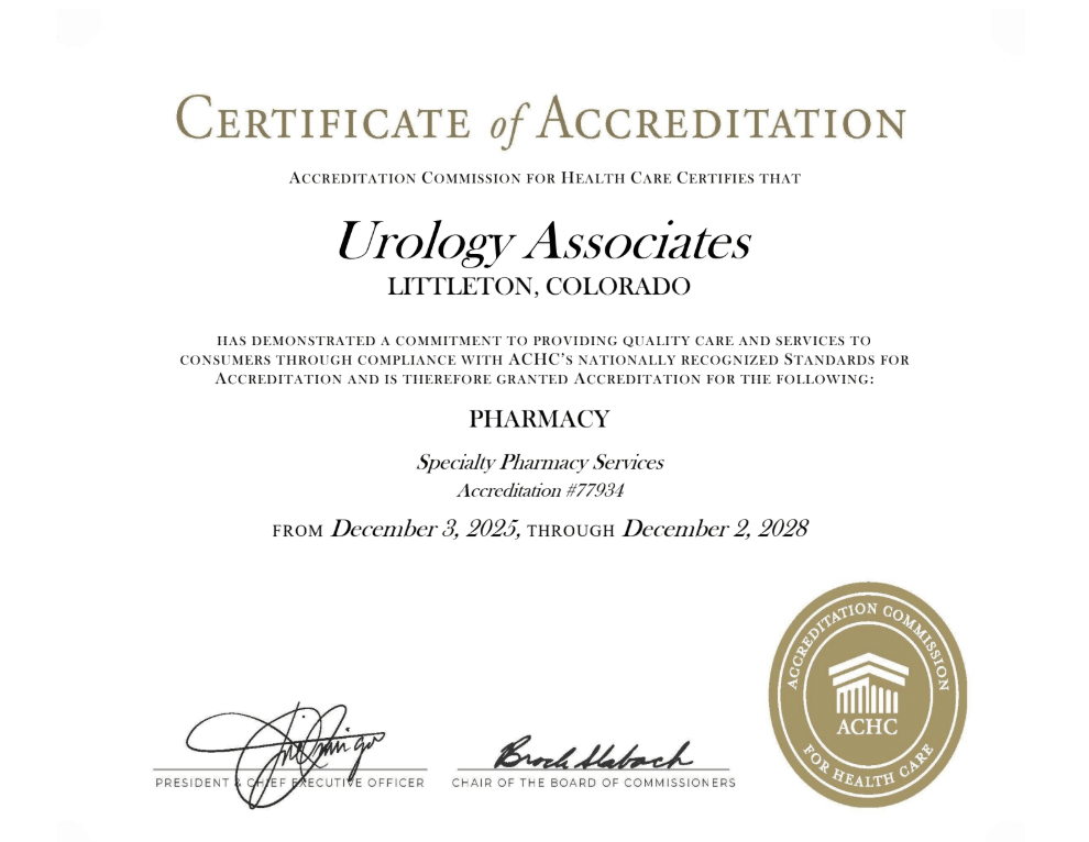 Urology Associates recently received accreditation in the Pharmacy program and services approved are Specialty Pharmacy Services and ACHC. To receive this accreditation Urology Associates in-office dispensary demonstrated that it operates at the highest level of quality, integrity, and effectiveness consistent with ACHC Accreditation Standards.